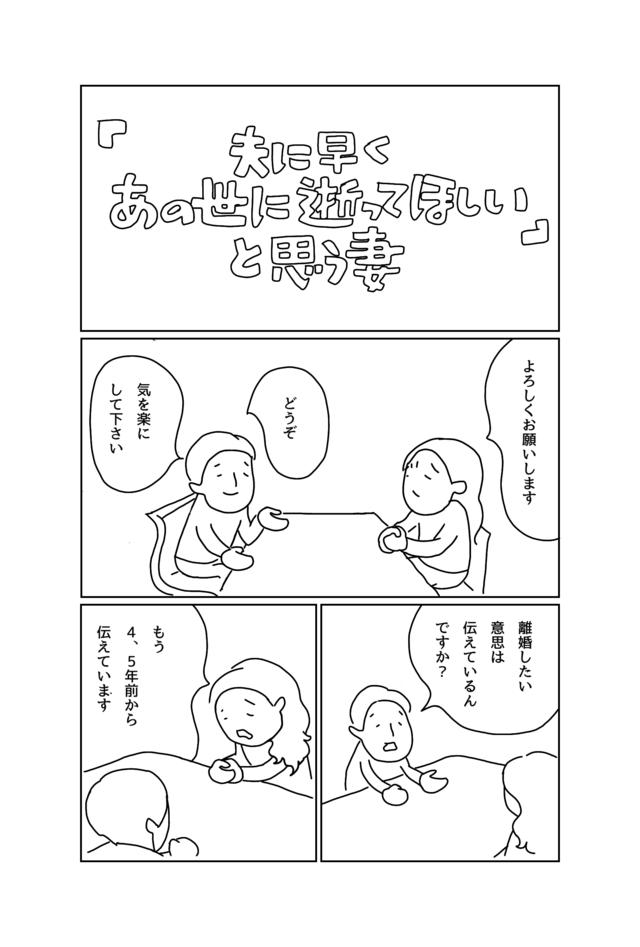 今回はそんな『夫は、妻は、わかってない。 夫婦リカバリーの作法』から、「夫に早くあの世に逝ってほしい妻」を漫画版にてお届けする。