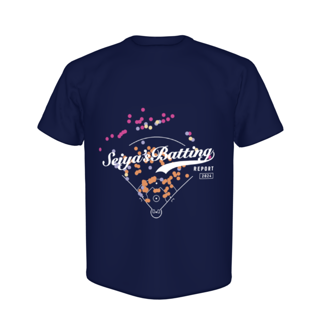 2024年シーズンにおける鈴木誠也選手のデータを基に、ヒットが飛んだ場所を記録したヒットスプレーチャートをデザインしたTシャツ。これまで鈴木誠也選手の活躍を伝えてきた「SEIYA'S BATTING REPORT」ならではのデータが一目でわかるデザインが特徴です。
