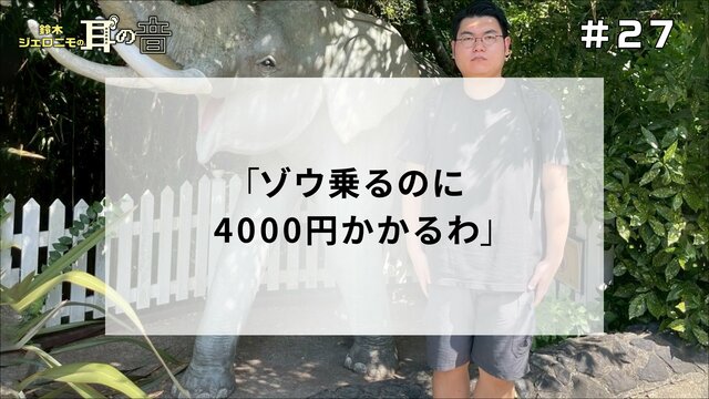「ちょっと一旦戻ろか」。え。なに。どした、どした。受付の手前の、ゲートの方まで戻ってくる。「あかん、ゾウ乗るのに4000円かかるわ」。