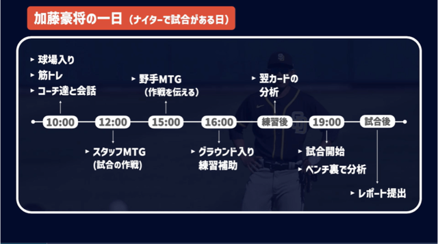 加藤 僕はメジャーリーグ・オペレーションズ、(訳せば)「メジャー運営」なので、それだけ聞くと、何をやっているか分からないと思うんですけど(笑)、今は本当に全部(の分析の仕事をする)っていう感じで、 先乗りスコアラーみたいな分析もしますし、今、メジャーにいる選手の分析や、自チーム(ブルージェイズ)の選手の分析もします。