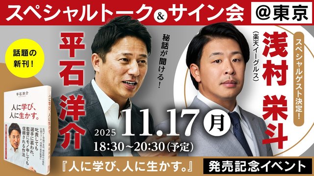 元楽天イーグルス・平石洋介さんの初著書『人に学び、人に生かす。』(平石洋介・著/SYNCHRONOUS BOOKS)発売を記念して、トーク&サイン会を11月17日(月)18時30分より都内イベントスペースで開催します!
