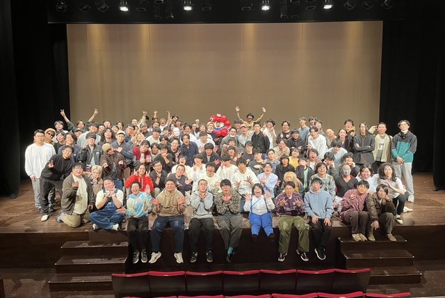 1人で前に出てギャグをしたり、何人かでくだりをしたり。100人が一斉に舞台に出るとあちらこちらで騒がしくなって収拾つかなくなるのでは、とも思っていた。しかし案外統率が取れている。1になるか、99になるか。そのどちらに身を置くかを瞬時に判断して私たちは行動する。揺蕩いながら、時に大きく水をかきながら、群泳する鮭のように私たちの動きそれ自体が次の流れを生み出していく。