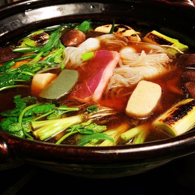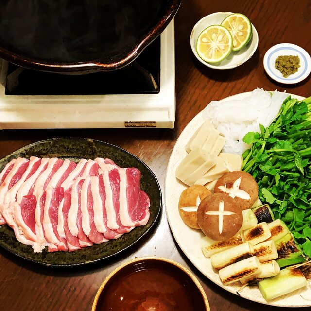 たっぷりのだし汁にみりんと醤油で薄めの蕎麦つゆを作っておき、鴨肉をさっとくぐらせて、柚子胡椒や黒七味で味変しながらいただけばいくらでも食べられます。周りをさっと焼き付けた長ネギとシャキシャキとした根っこが美味しい芹、ふわふわの生麩もこの鍋を美味しく食べるための大切な脇役です。