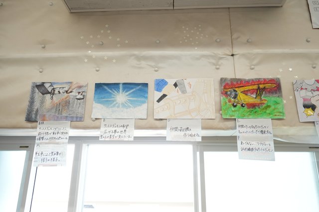 その後は年月を遡り、サントス・デュモンが大空を夢見て仲間たちと飛行機作りを開始したところから、試行錯誤と産みの苦しみ、飛行機の完成、それが戦争の道具にされる哀しみと平和への思い、希望を失わずに未来に向けて飛ぶ様子をエピソードと絵にした。そして、最後はサントス・デュモンが手がけた飛行船の写真を貼りつけた。
