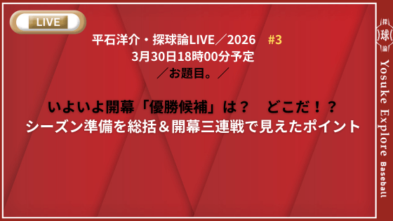 (LIVE配信の開始時刻30分前になりましたらログインしていただくと視聴画面が表示されます。「平石洋介の探球論」会員限定です。以下より会員登録いただけます。)