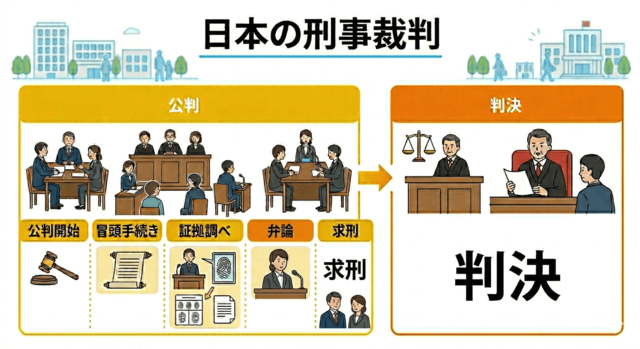 日本の刑事裁判は「冒頭手続」→「証拠調べ手続」→「弁論手続」を経て、「判決」となりますが、通常の裁判は1日1つの手続きで終了します。つまり「冒頭手続」のみ、「証拠調べ手続」のみで、裁判手続きが終了し、次の手続きは後日(1か月後など)に行われます。