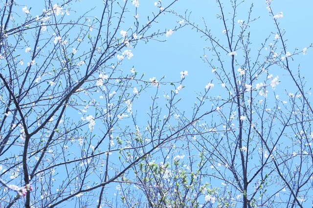 頭上では山桜が満開、ヒバリのさえずりが響き、遠くの山々はまだ雪山。