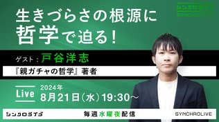 8月21日(水)のシンクロLiveは、『親ガチャの哲学』(新潮新書)など、現代社会の課題を哲学の視点から考える著書を多数出版している気鋭の哲学者・戸谷洋志さんにご登場いただきます。
